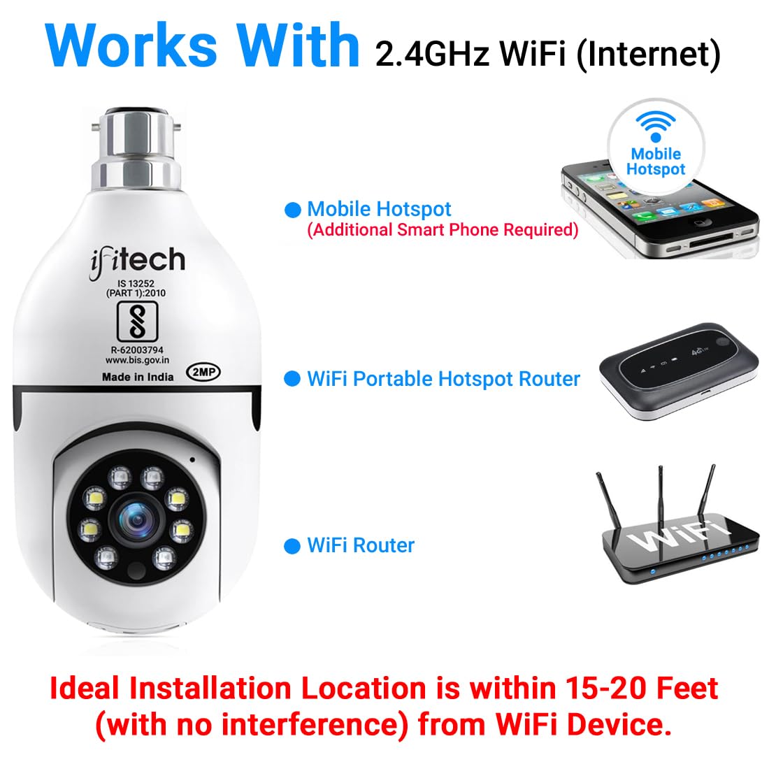 • [2.4GHz WiFi Connectivity]: IFITech Bulb Security Camera supports 2.4GHz WiFi, ensuring stable connectivity with home and office networks. [Note]: Install camera within 10-20 feet of the Wi-Fi router/hotspot for best performance. No 5GHz support.